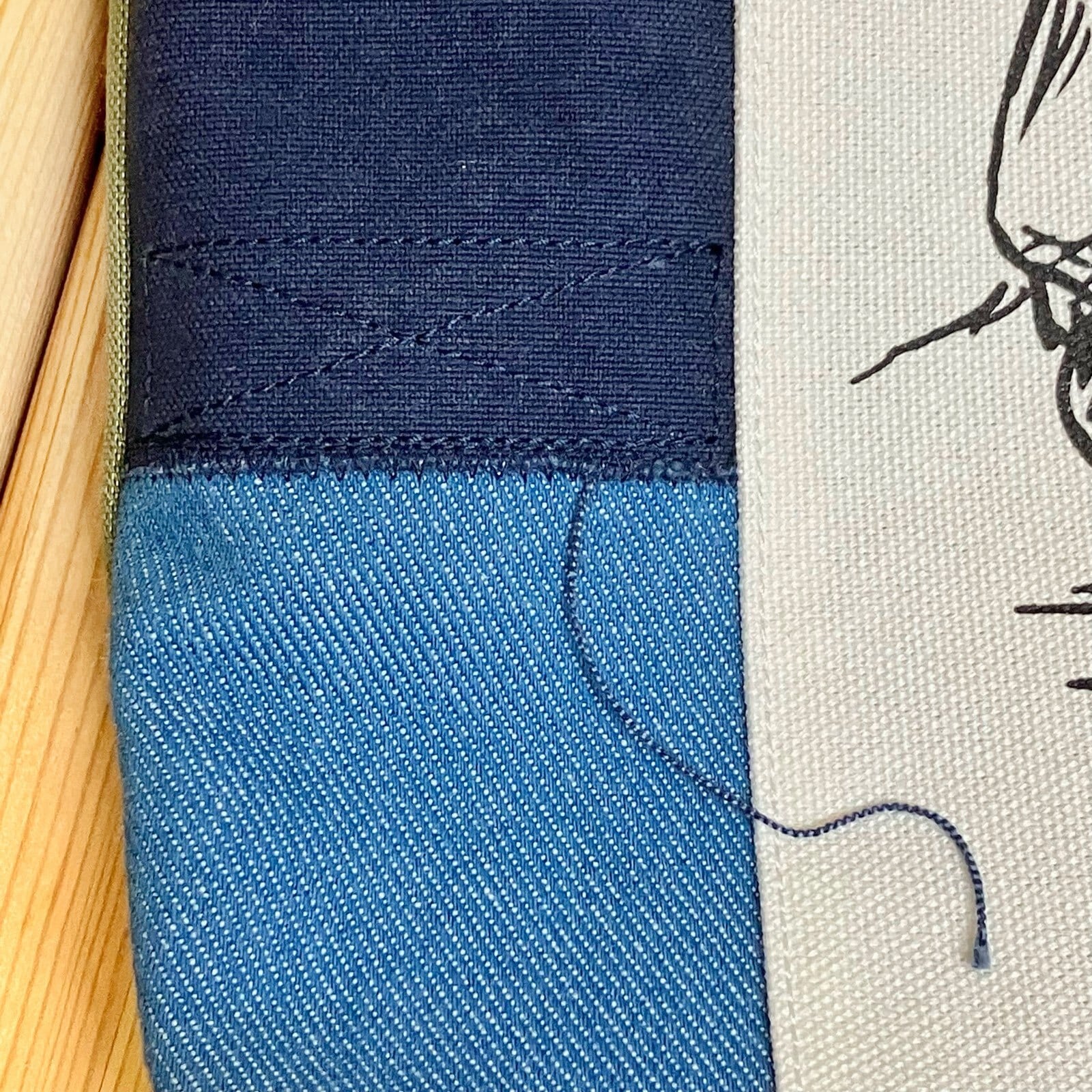 部分的にキャンバストートを解体した生地を使用して作っており、場合によっては元々のキャンバストートの折り目や縫い目、プリント、汚れなどをあえてそのまま残しているため、独特の風合いを生み出しています。