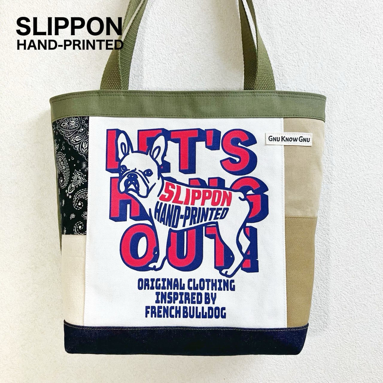 表面には最新デザインのHANG OUT!をプリントしたキャンバス地をメインに、周りをさまざまな生地で彩りを添えた手の込んだ商品となっています。