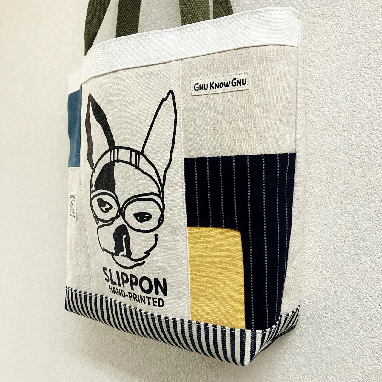 表面には開業当初からのフレンチブルドッグのイラストをプリントしたキャンバス地をメインに、周りをさまざまな生地で彩りを添えた手の込んだ商品となっています。
