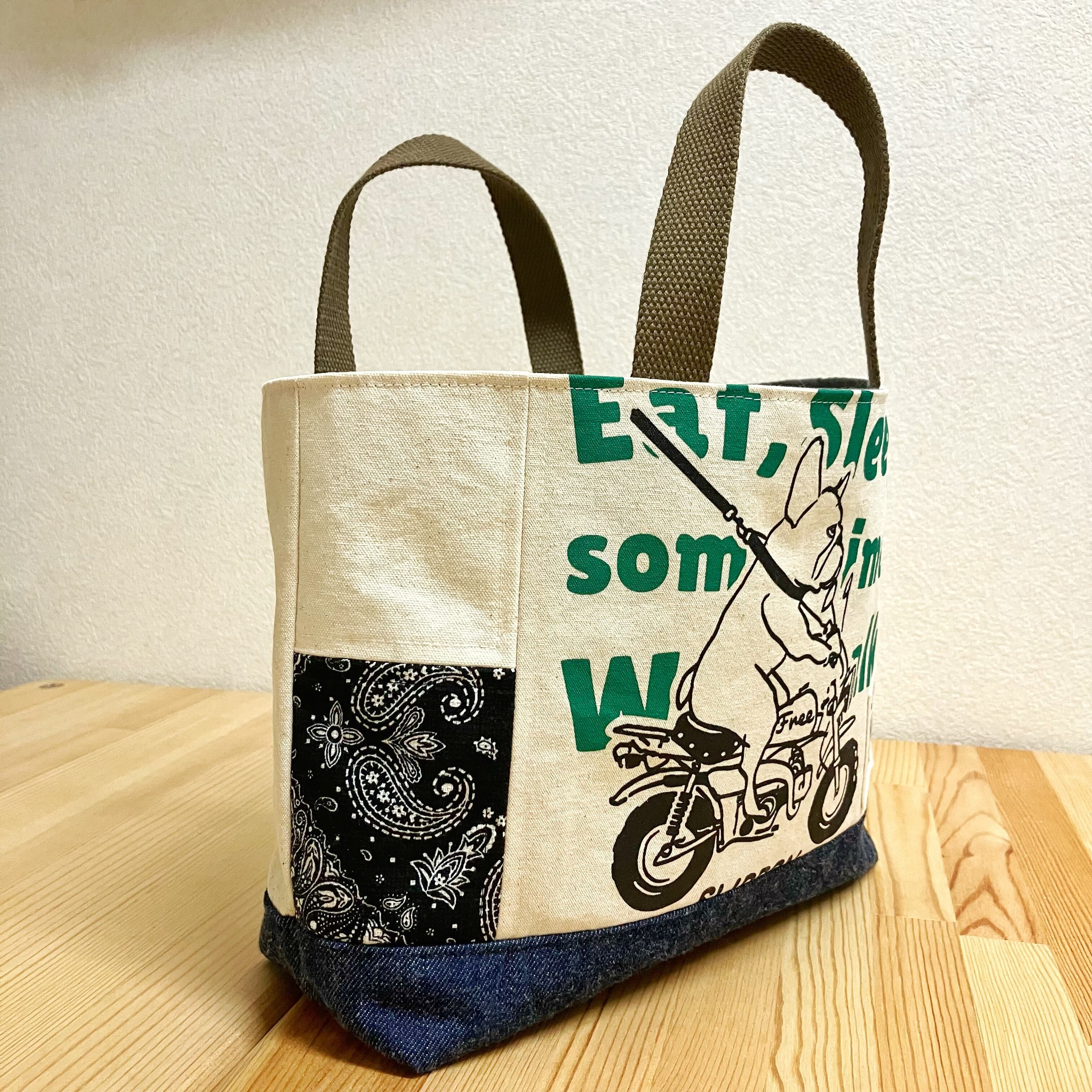 ※ 不要となった生地を使用していますので、最初から生地に馴染んだ感じがありますが、完成したトートバッグとしては未使用です。